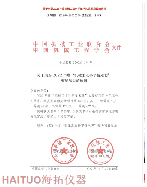 海拓儀器榮獲2022年度中國機械工業(yè)科學技術獎?ICC訊?10月20日,2022年度“中國機械工業(yè)科學技術獎”項目名錄正式發(fā)布,由海拓儀器(江蘇)有限公司完成的“超快速冷熱沖擊試驗系統關鍵技術研究與系列應用”項目榮獲2022年度“中國機械工業(yè)科學技術獎”三等獎。??據了解,中國機械工業(yè)科學技術獎是根據《國家科學技術獎勵條例》和《社會力量設立科學技術獎管理辦法》的有關規(guī)定,由中國機械工業(yè)聯合會和中國機械工程學會共同設立并經國家科學技術部批準,在國家科技獎勵主管部門登記的面向全國機械行業(yè)的綜合性科技獎項。旨在表彰在機械工業(yè)科技工作中作出突出貢獻的單位和人員,獎勵范圍包括:機械工業(yè)科學技術發(fā)明成果、機械工業(yè)科學技術進步成果、機械工業(yè)工程化和新技術推廣成果和機械工業(yè)軟科學和標準成果。??海拓儀器是一家集研發(fā)、制造、貿易于一體高科技現代化公司,公司成立于2005年,主要產品包括:超快速冷熱沖擊試驗機(熱流儀)、快速溫變應力篩選試驗箱(ESS),